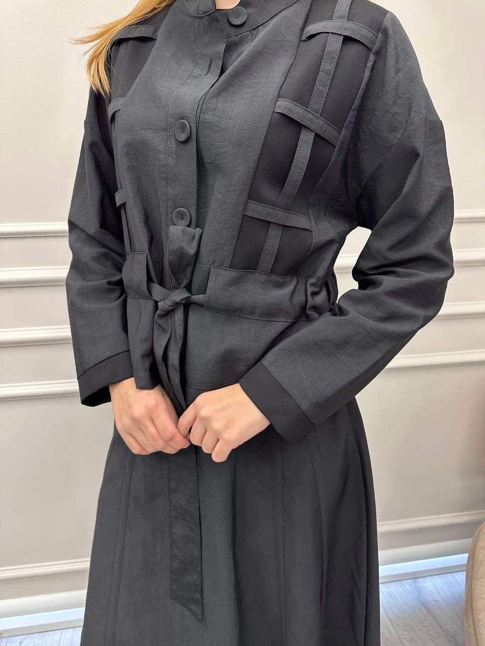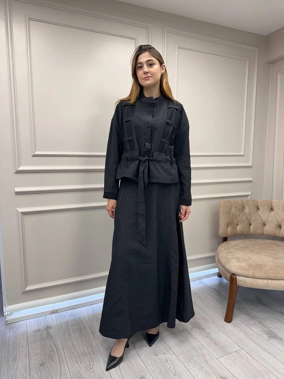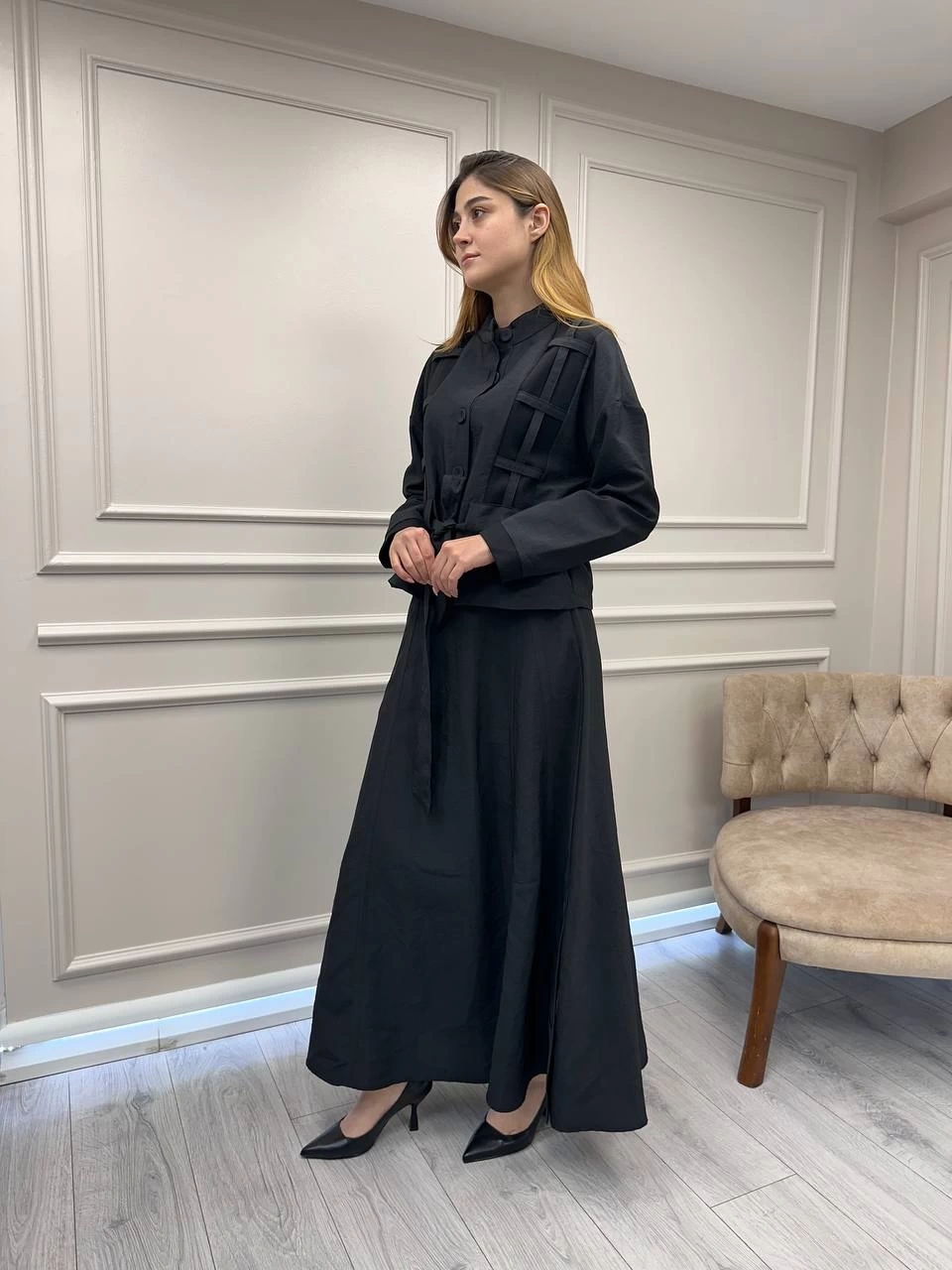 Ceremony Siyah Ceketi Kafes Detaylı Eteğin Yanları Düğme Detaylı Takım