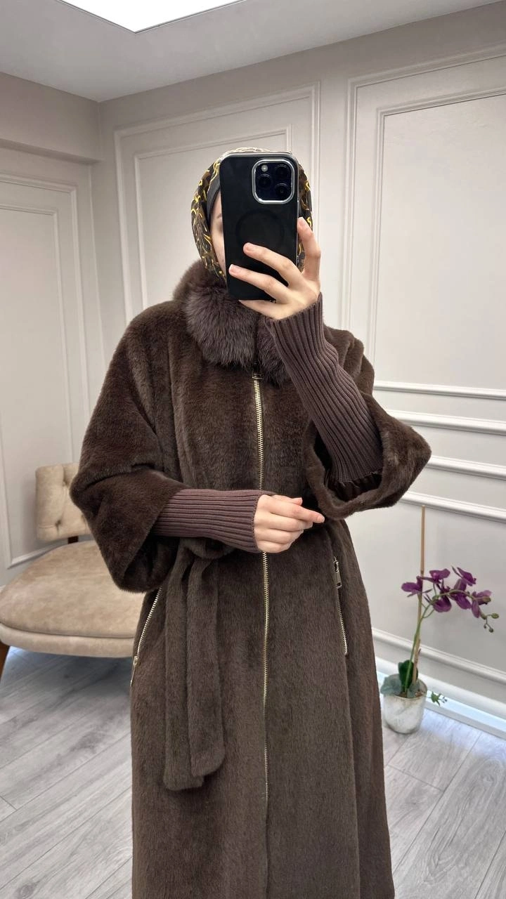 Etrucci Kahve Fermuar Triko ve Kürk Detaylı Angora Kaban