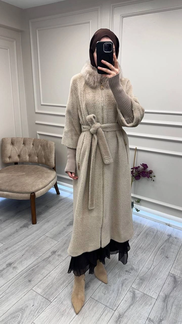 Etrucci Koyu Bej Fermuar Triko ve Kürk Detaylı Angora Kaban