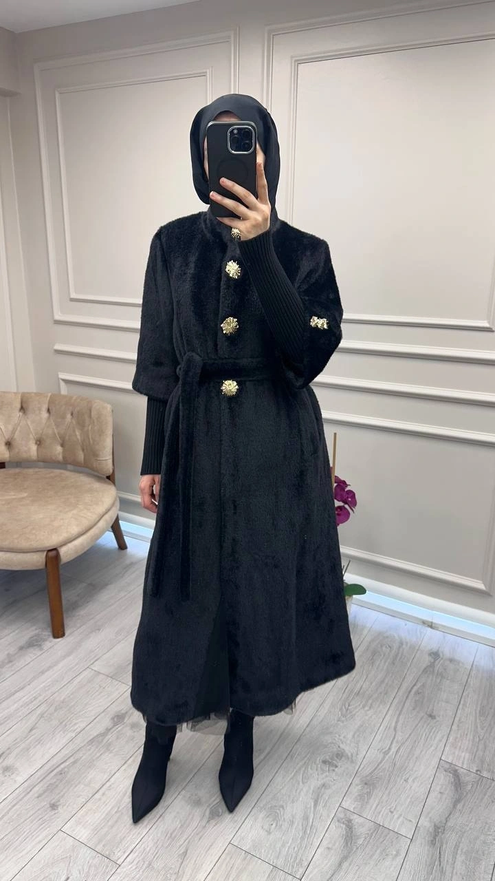 Etrucci Siyah Hakim Yaka Triko Ve Düğme Detaylı Kaban