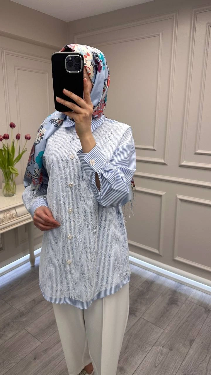 Ghisa Mavi Önü Dantel Detaylı Tunik