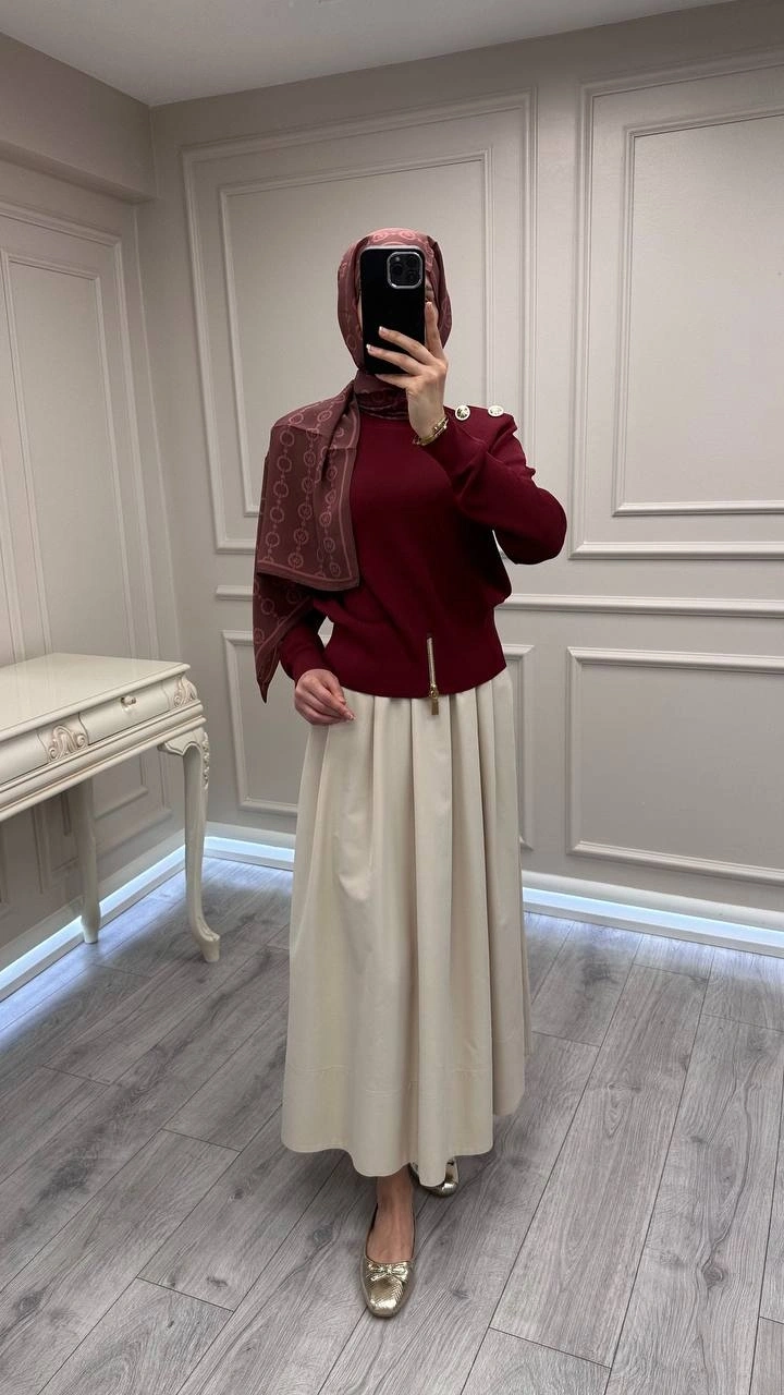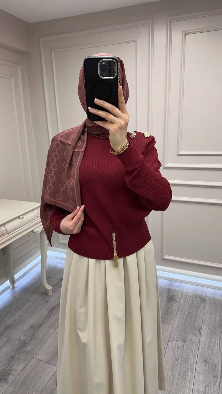 Ghisa Bordo Vatkalı Fermuar Detaylı Merserize Tunik