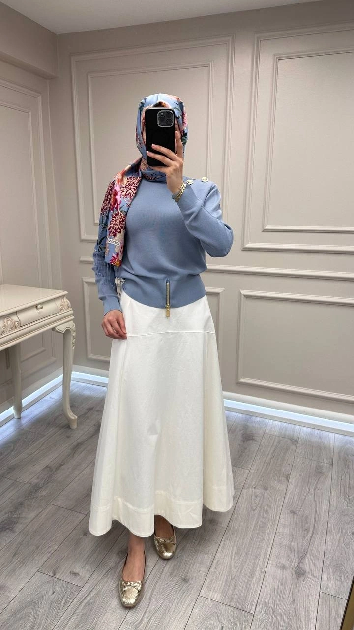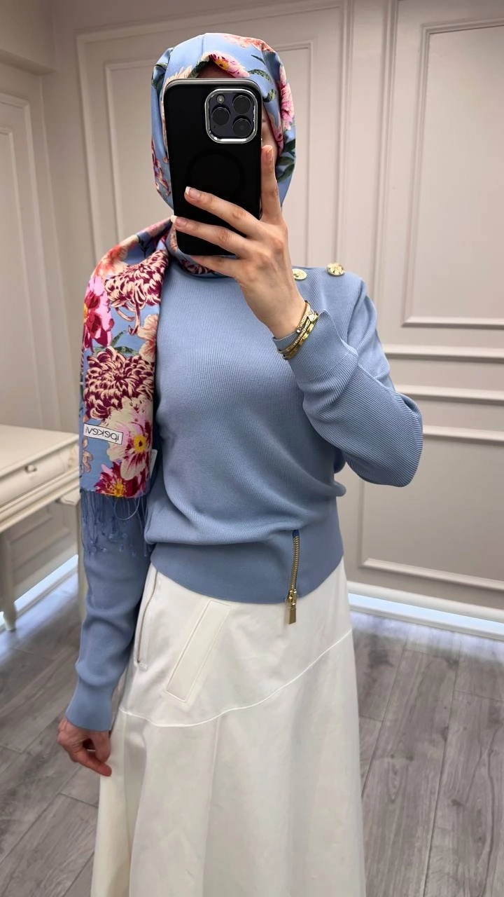 Ghisa Mavi Vatkalı Fermuar Detaylı Merserize Tunik