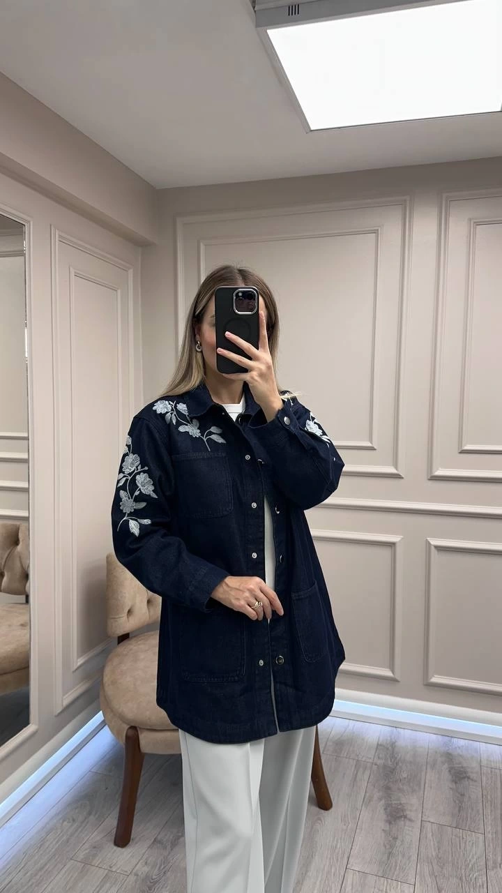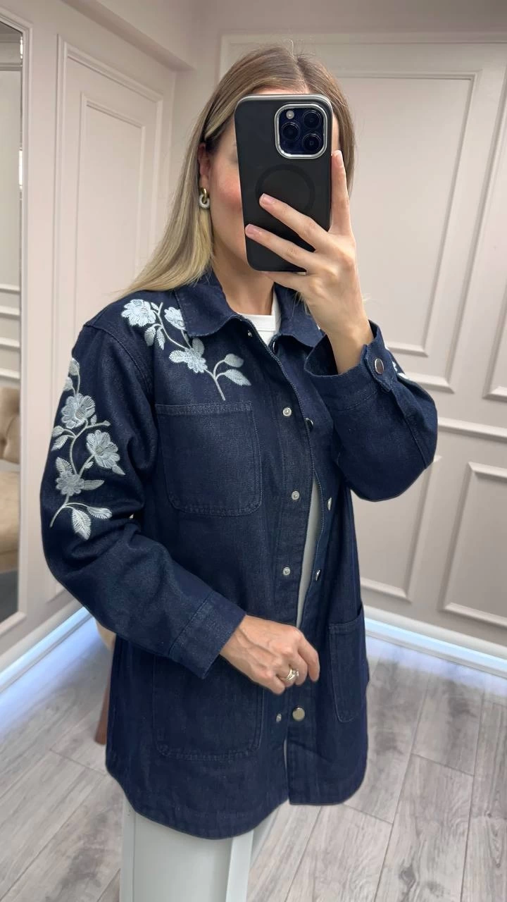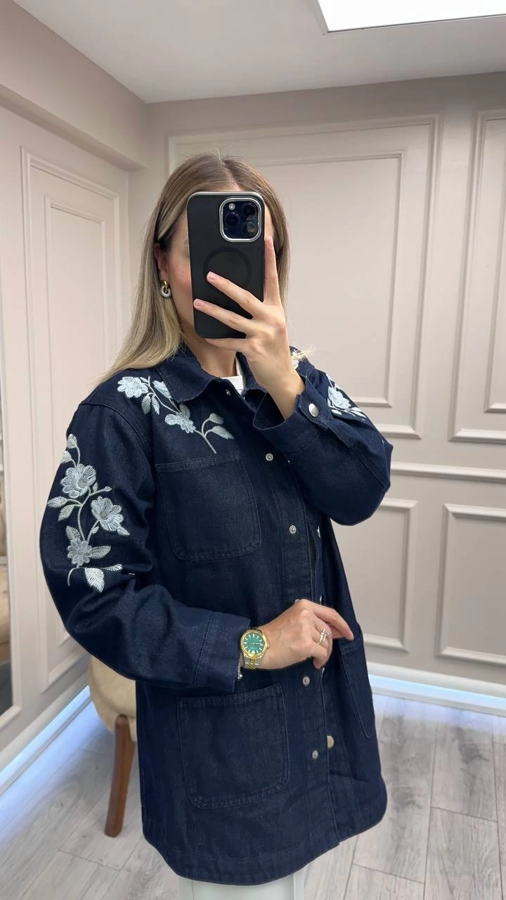 Magazin Koyu Lacivert Çiçek Desenli Kot Ceket