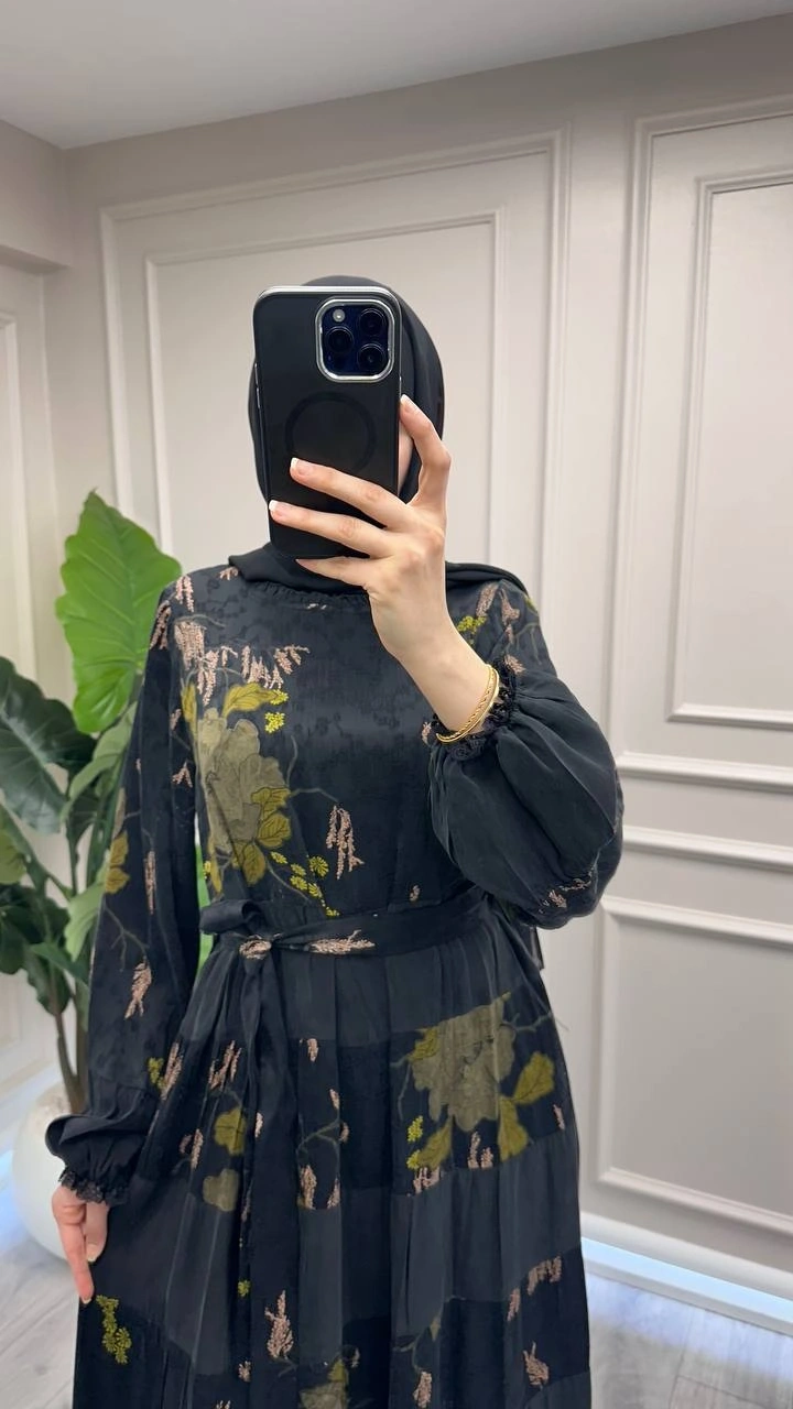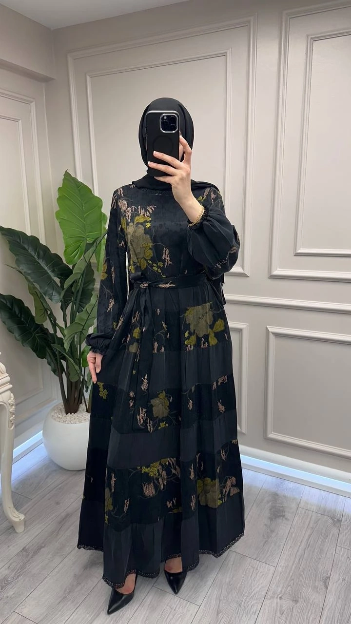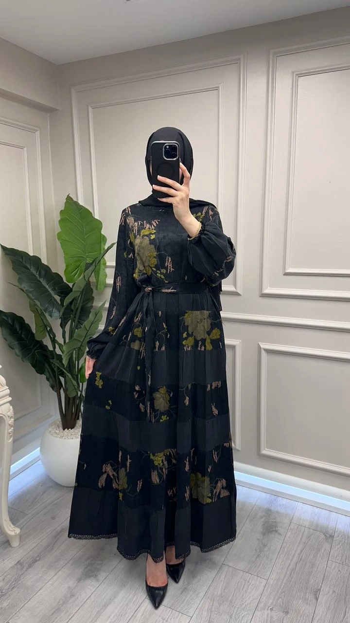Misswhence 39843 Siyah Şerit Detaylı Desenli Elbise