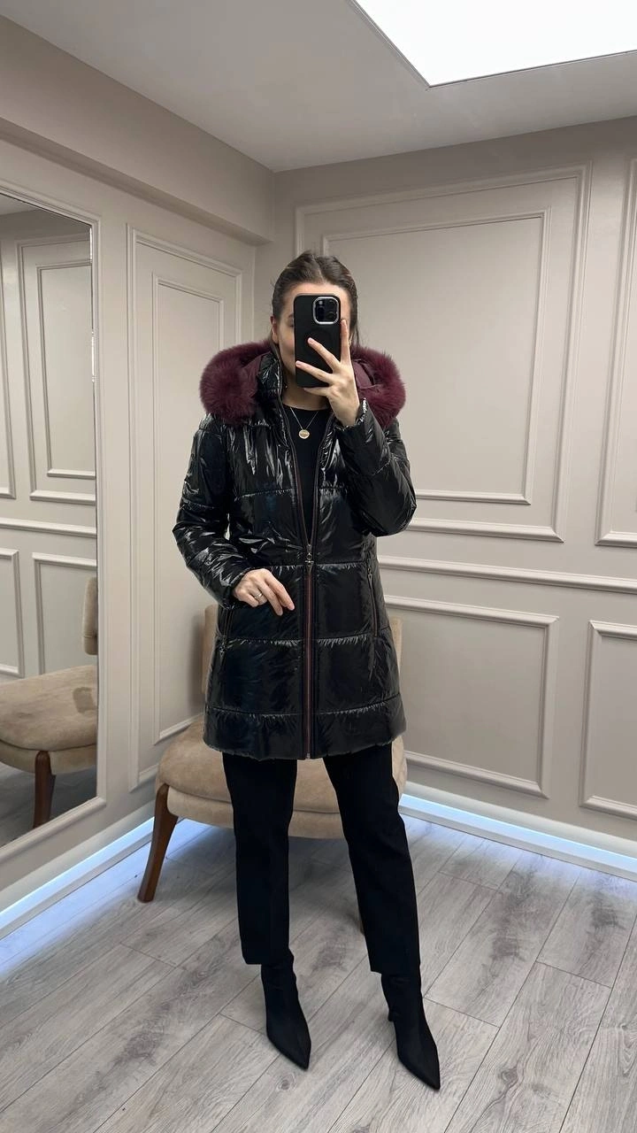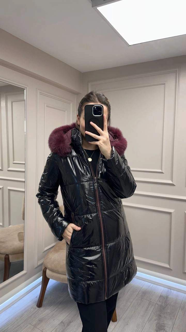 Trenç Siyah Parlak Kapüşonlu Kapitone Kaban